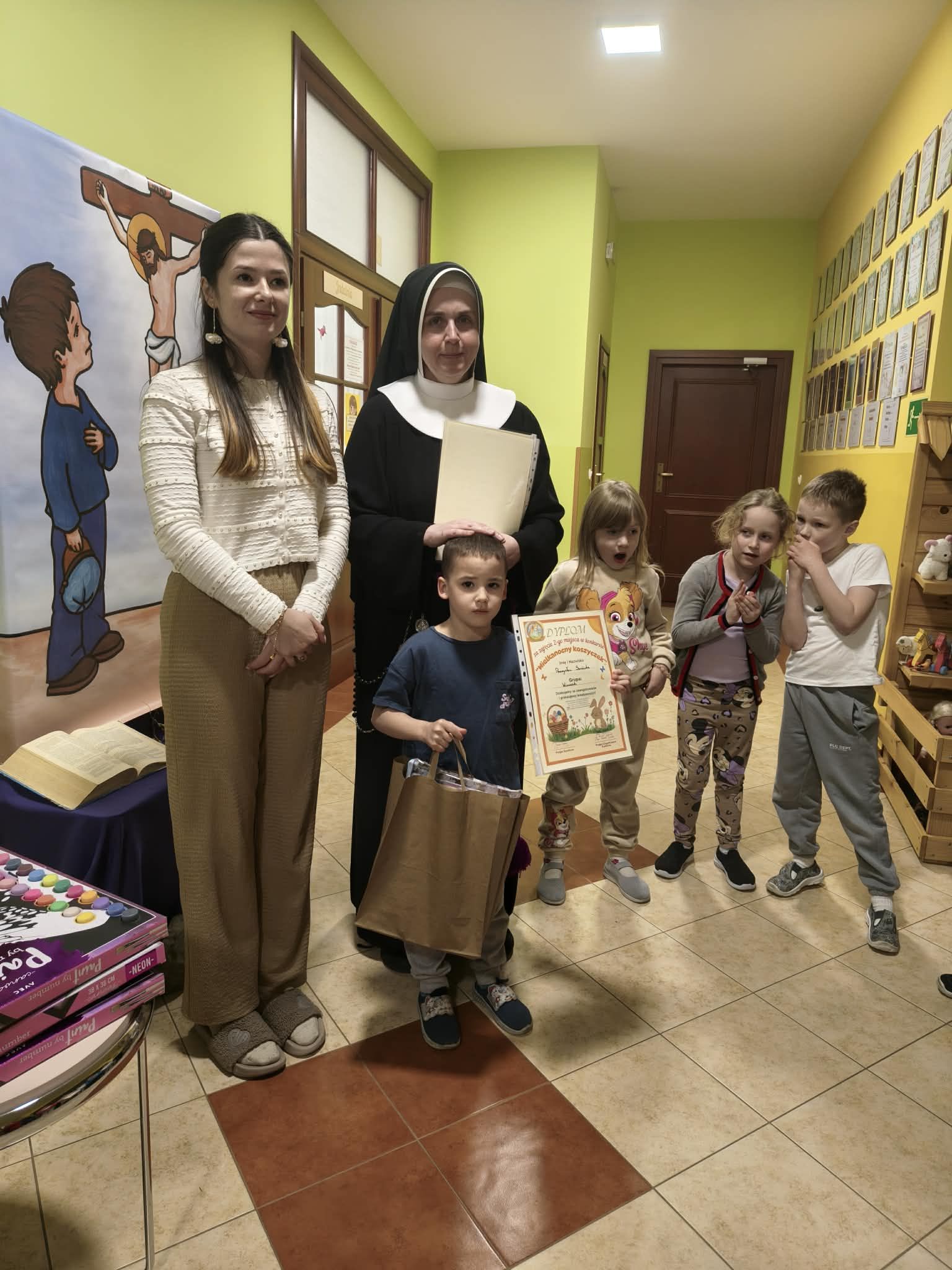 Droga krzyżowa w kaplicy sióstr miała wyjątkowy i uroczysty charakter. Wzięły w niej udział zarówno dzieci, jak i pracownicy, co stworzyło piękną atmosferę wspólnoty. Poszczególne stacje były prowadzone w prosty i zrozumiały sposób, a krótkie rozważania pomagały wszystkim lepiej przeżyć ten czas refleksji i modlitwy. Dzieci aktywnie uczestniczyły w nabożeństwie – śpiewały pieśni, które dodawały całemu wydarzeniu radości i wzruszenia. Ich zaangażowanie sprawiło, że droga krzyżowa była nie tylko chwilą zadumy, ale też żywym i pełnym serca przeżyciem dla wszystkich obecnych.
