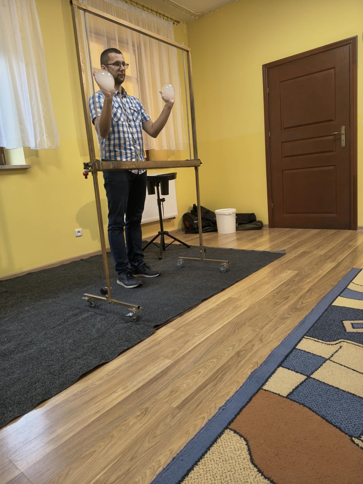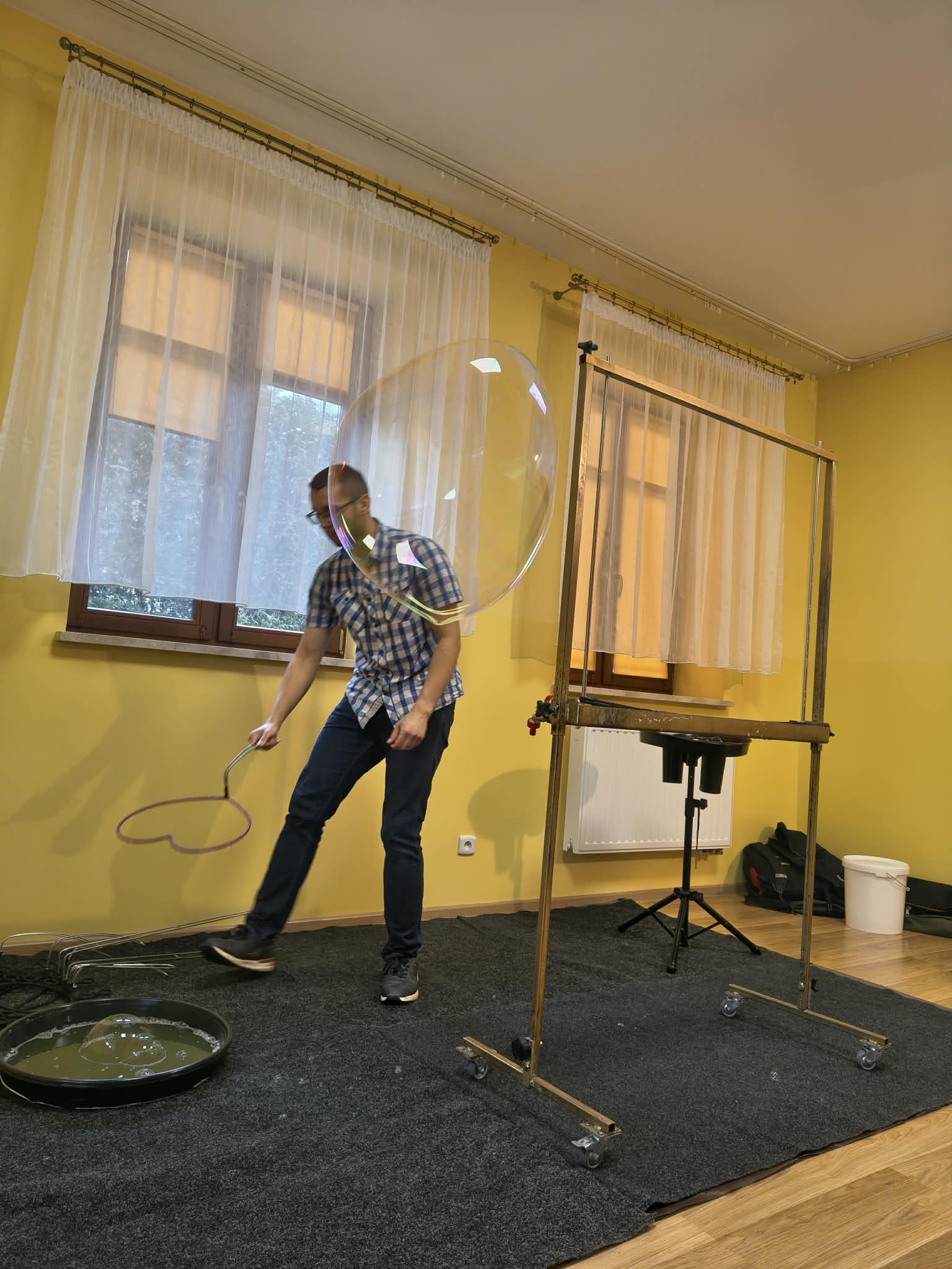 Tego dnia nasza sala gimnastyczna zamieniła się w magiczną przestrzeń pełną kolorowych baniek mydlanych. Pan zaprezentował niezwykły pokaz, który zachwycił wszystkich obecnych. Z ogromną pasją i pomysłowością przedstawiał różnorodne techniki tworzenia baniek – od maleńkich, delikatnych kuleczek po imponujące, wielkie, przezroczyste sfery unoszące się nad głowami dzieci.
