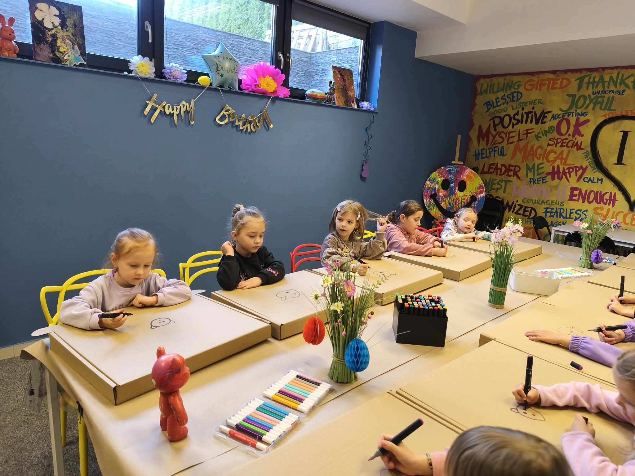 Dzieci już od samego rana były pełne energii i podekscytowania, nie mogąc doczekać się wyjazdu. Po dotarciu na miejsce zostały serdecznie powitane przez Panie Amelię oraz Samantę, które wprowadziły wszystkich w twórczy nastrój i z dużym zaangażowaniem przygotowały wiele ciekawych aktywności.