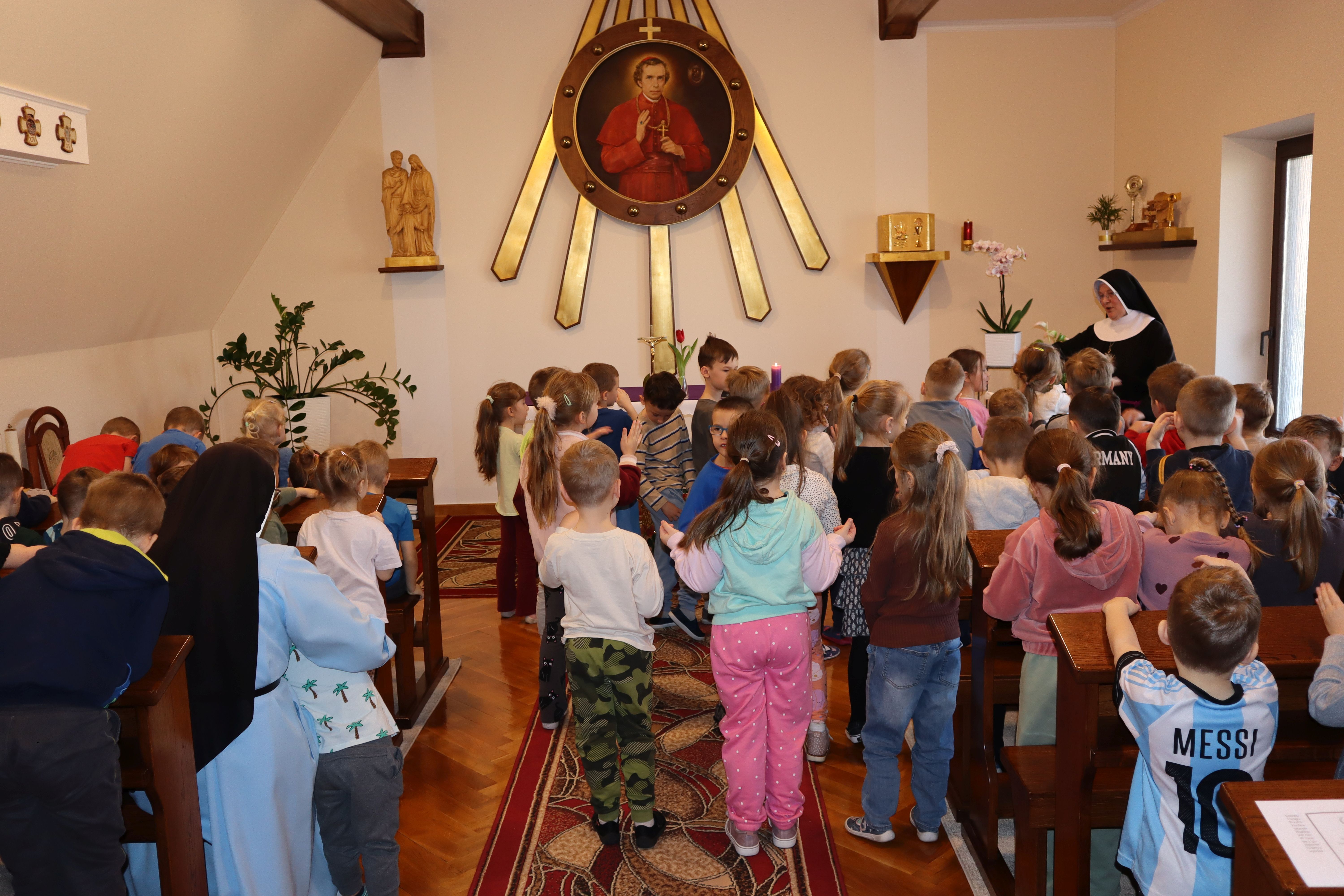 Nasze przedszkole również obchodziło to ważne święto. Dzieci oraz pracownicy odświętnie ubrani zebrali się na sali gimnastycznej, by uczcić ten piękny dzień. W tym szczególnym dniu nie mogło również zabraknąć naszych Sióstr, którym to święto było dedykowane oraz podziękować za Ich oddanie oraz opiekę każdego dnia.