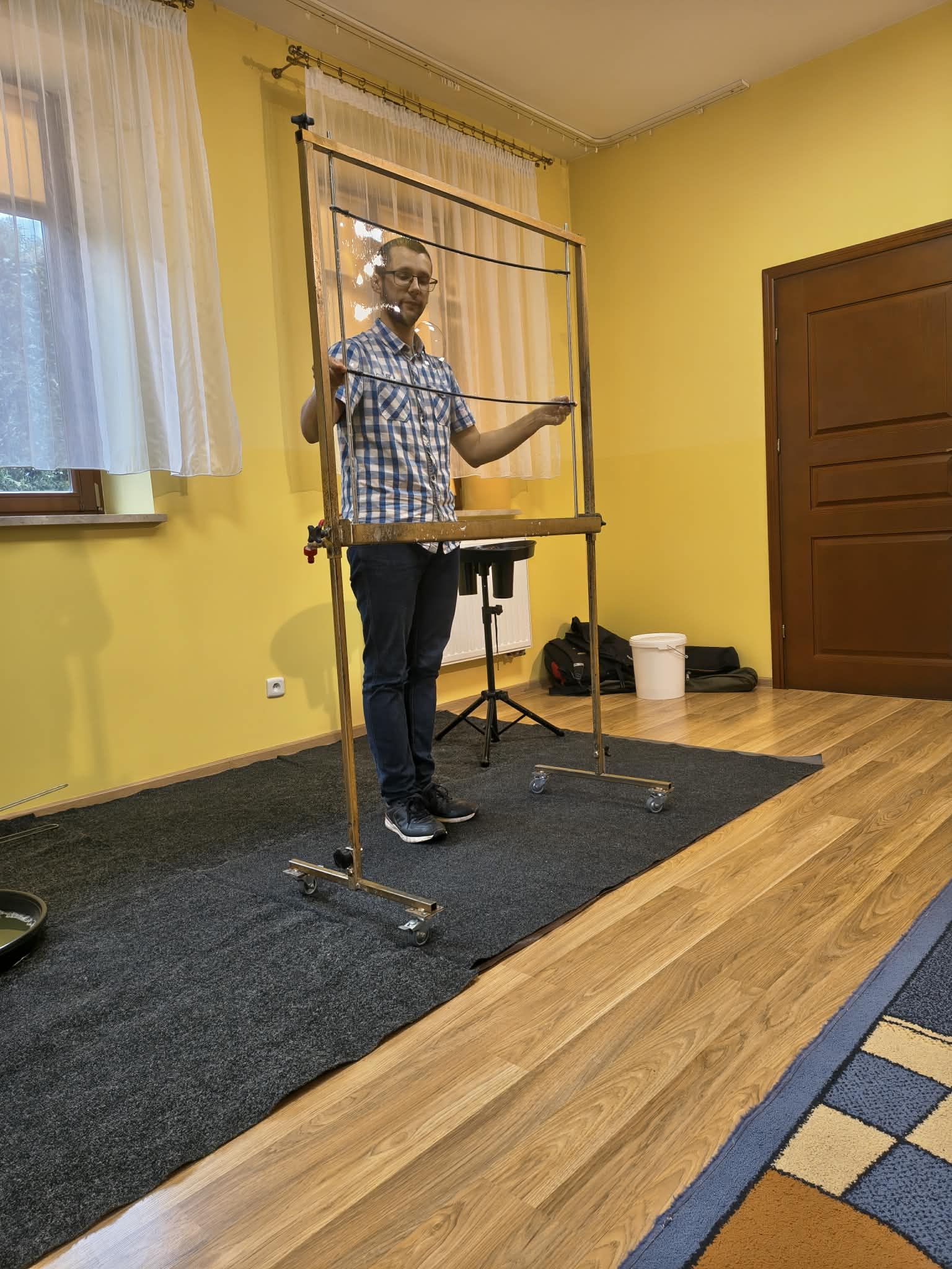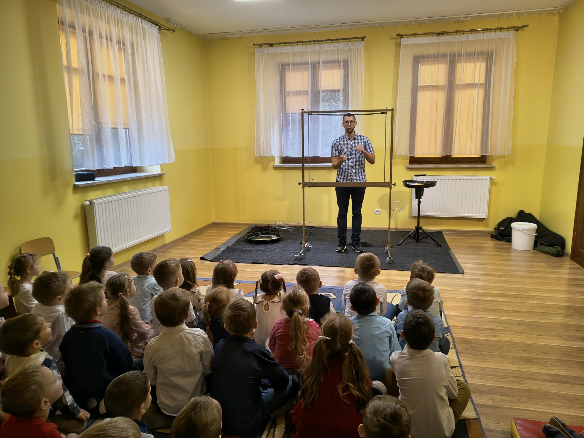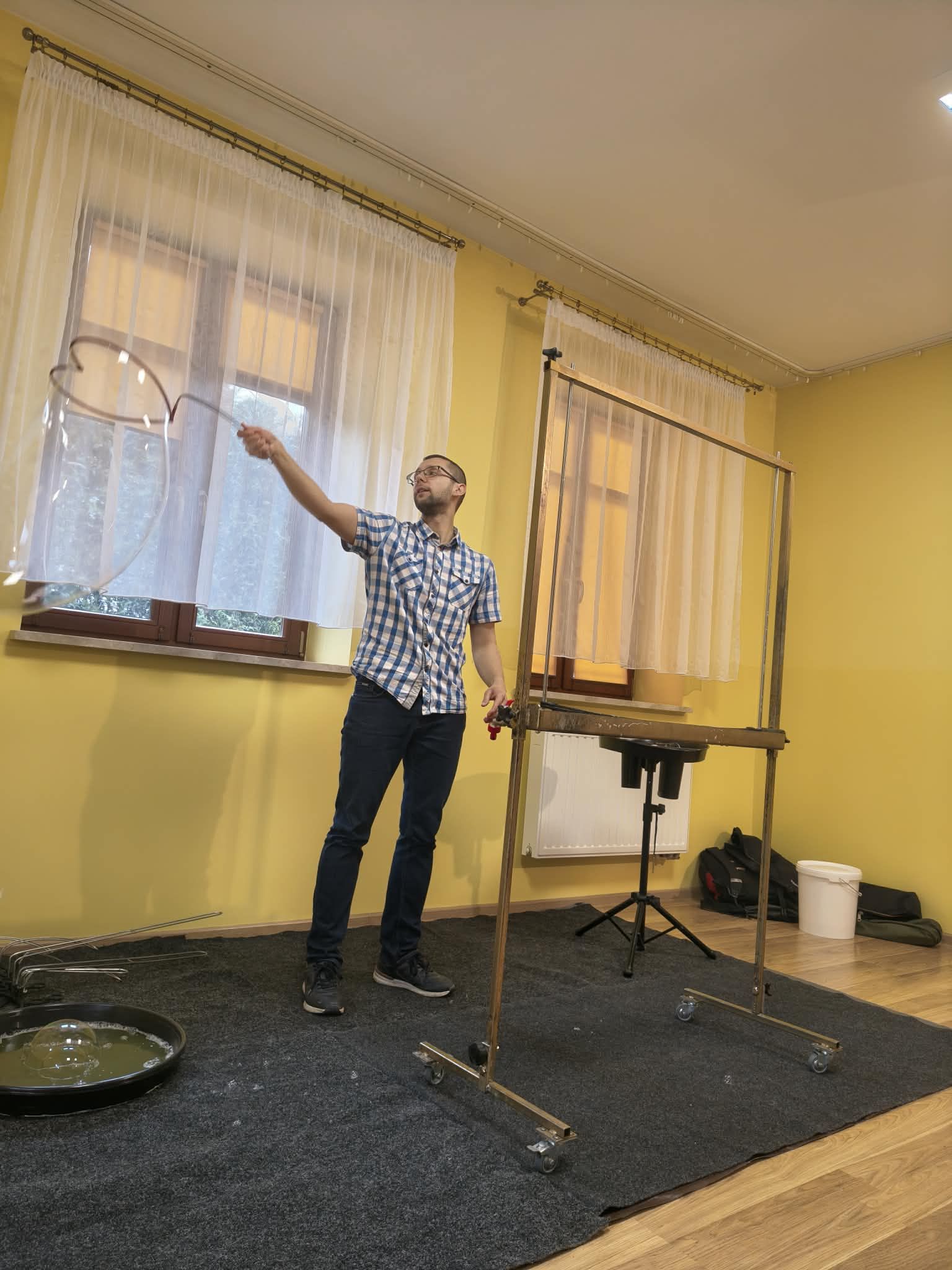 Tego dnia nasza sala gimnastyczna zamieniła się w magiczną przestrzeń pełną kolorowych baniek mydlanych. Pan zaprezentował niezwykły pokaz, który zachwycił wszystkich obecnych. Z ogromną pasją i pomysłowością przedstawiał różnorodne techniki tworzenia baniek – od maleńkich, delikatnych kuleczek po imponujące, wielkie, przezroczyste sfery unoszące się nad głowami dzieci.