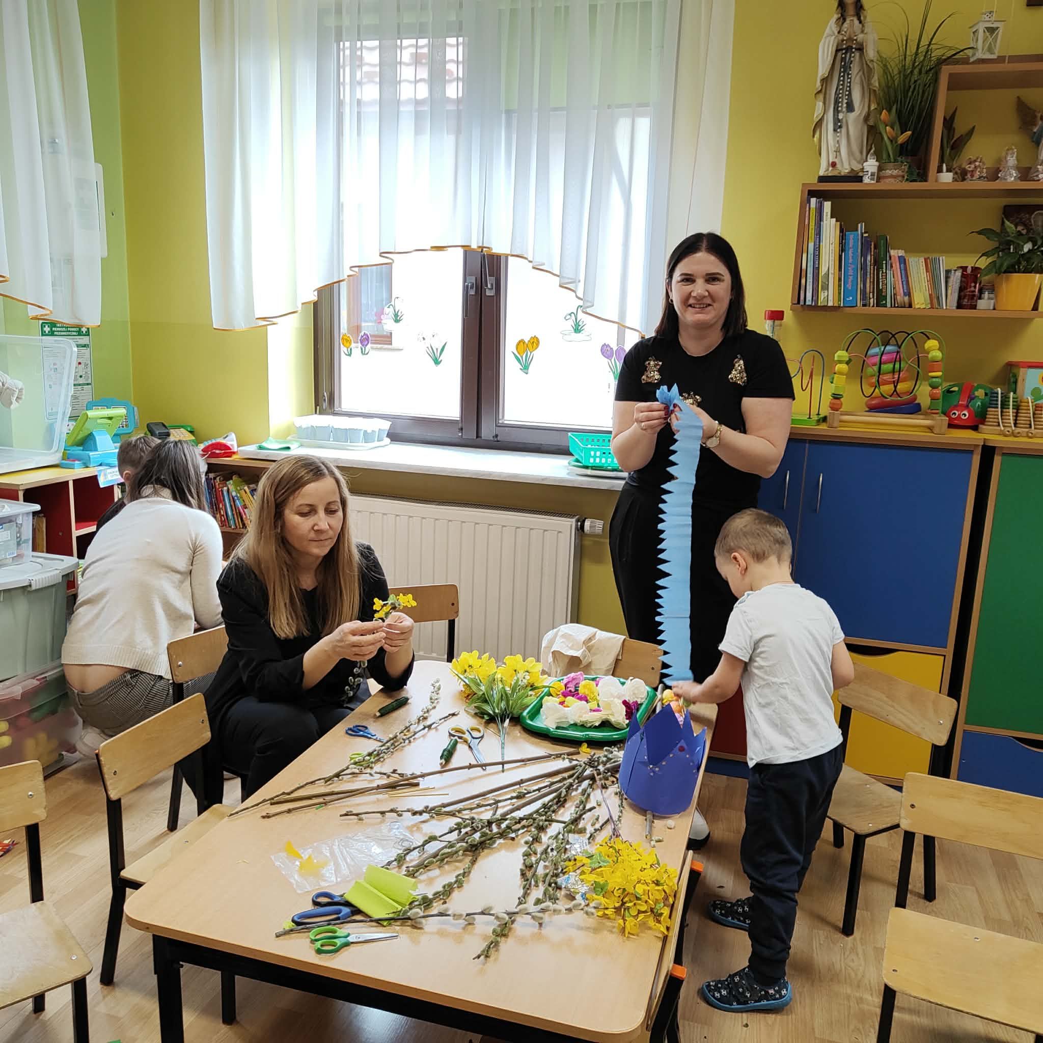 W Sali nie zabrakło rozmów, śmiechów i wspólnego podziwiania postępów w pracy. Wspólne działania sprawiły, że czas minął bardzo szybko, a efekty przerosły nasze oczekiwania. Każda palma była niepowtarzalna, pełna radości i ciepła, a dzieci z dumą prezentowały swoje dzieła. To była nie tylko zabawa , ale także okazja do zbliżenia się do pięknych tradycji związanych z Wielkanocą, które będą towarzyszyć nam przez wiele lat.